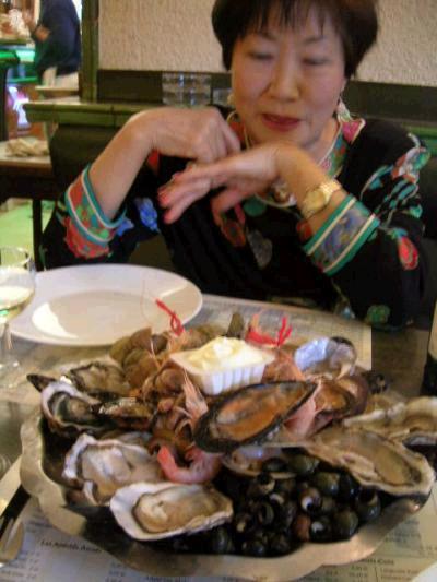 魚介類の盛合にはエビ、牡蠣、ムール貝にとこぶし、はまぐり、サザエに