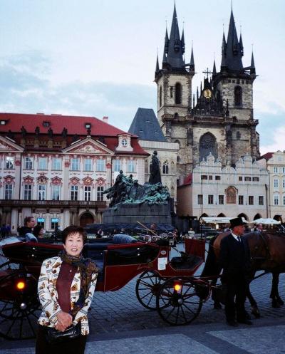 ←◆『旧市街広場の馬車の前で。奥に見えるのがティーン教会♪』