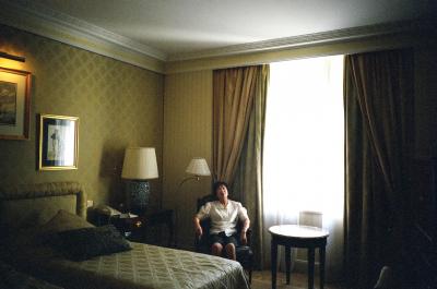中庭を囲む廊下をグルっと廻りエレベーターに乗って部屋に行きました。ここは昔ながらの重い鍵を使用していて二重にグルグルと廻して・・最後に「グッ」と押し上げる様に力を入れないと開かないんですよ(汗)