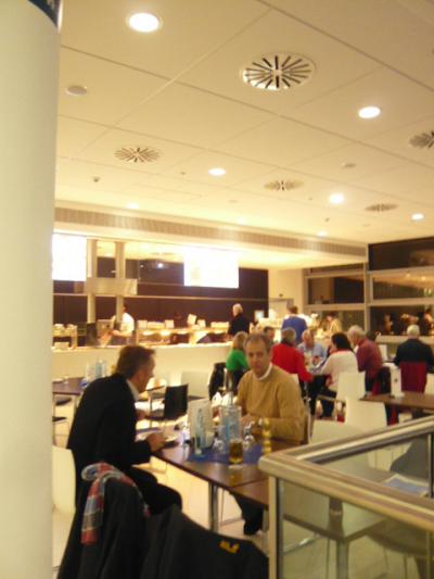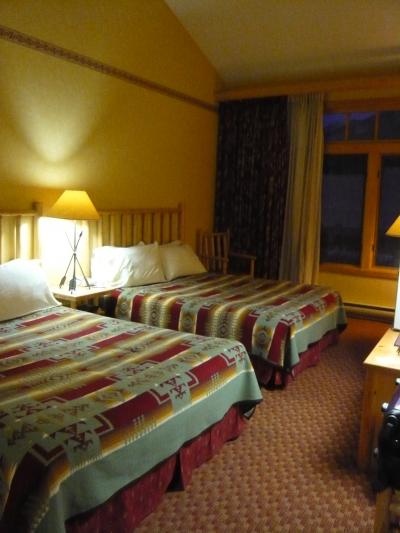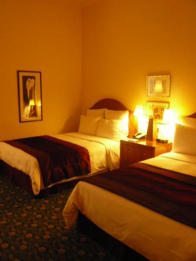 部屋は広めでウッディな感じす。ベッドサイドにポットがあって、向かいはメキシコ料理でしたヨ。バスルームも広くバスタブ完備。朝食ルームは地下にあって、パンとシリアルとジュースと、コールドミールだけでした。でも空港からのバスはすぐ前に止まるので、その点は便利でした。