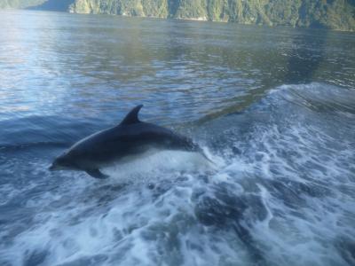世界遺産であるフィヨルドのクルーズツアーがあるのですから、是非参加して見たかった!フィヨルドの複雑な地形の間を縫うように進みますが、途中からイルカの群れが並走する姿はちょっと感動しますよ!色々ツアーがあったのですが、私達は安いJUCYクルーズの一日ツアーに参加しました!ランチにブッフェ付でなく軽食付で、大き目のサンドイッチとジュース、スナックと果物もセットされ、小食な私達には丁度良かったです!