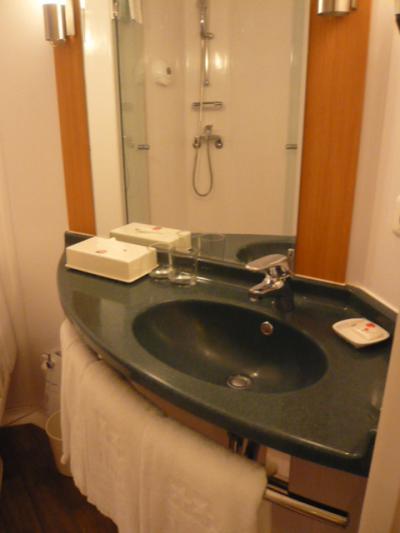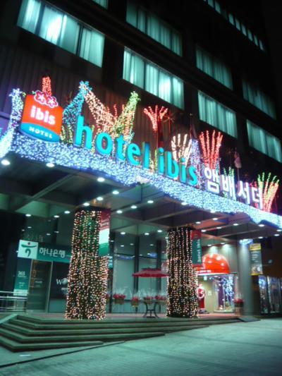 バスはibisホテル前に停まります。ibisホテルの派手な入口にクリスマスの飾り付けですね。サンタ横の看板に日本語もツインをリクエストしたのに、少なくてダブルになった模様(汗)先に到着してたHさんもダブルだったので毛布と布団をもう一組確保したそうで・・私達の到着時には毛布も布団も無かったッス。バスルームはシャワーのみでバスタブはありませんでした。ibisならツインが多いハズと思ったのに・・ハズレたスリッパもありましたし、ギリギリで予約しても安かったし。ホテル入口付近に無料の巡回バスの表示がされていましたヨ。