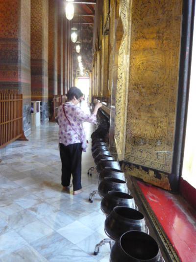 ワットポーは横に寝そべった巨大な金ピカの仏像の神様でした。タイは生誕曜日毎の神様がいて寝てるのは「火曜の神様」とか?そして、長い足の足の裏には・・凄く複雑な指紋がありました!ここは20バーツ払って「108の小判を投げ入れる御祓い」がある。108個入れると幸せになれるそうで108って「煩悩の数」って事? 銅壷にチャリチャリと言わせながら小判型の物を放り入れますが、ウチの母親は煩悩の数が多いらしく最後になっても小判が余ってた(爆)ワットポーの頭部はドリアン風で(笑)周辺に金箔が張られてます。 ここはマッサージでも有名で敷地内にマッサージ学校があるそうで、マッサージも受けられるらしく東屋にツボや経絡図がありました。