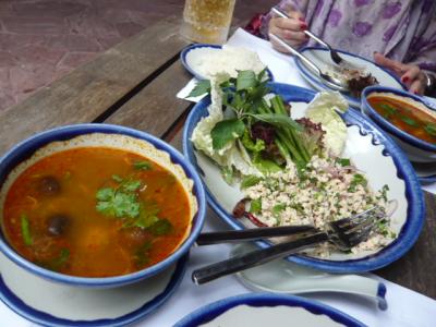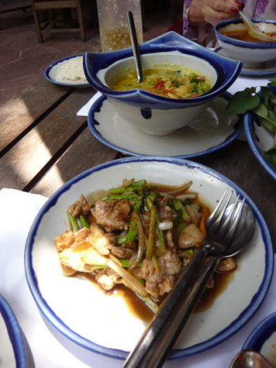 シェラトングランデのプールサイドのオープンテラス席の「The Sala」でタイ料理を戴きました。ツアーの市内観光にSETされたメニューですが美味しかった。最初に挽肉と玉葱のサラダで、辛すっぱくて美味。タイ料理と言えばトムヤムクンですが「クン」は蝦で、私達はトムヤムヘッで「ヘッ」はマッシュルームの事だそうです。これが辛くて喉も痛く咳も汗も出るんだけど凄く美味しい。豚と大蒜の茎のオイスター炒めは辛くなくホッとする味。白いのは野菜と豆とココナツミルクのカレーで甘辛くて美味。 デザートはココナッツミルクとパパイヤと若緑色の何か?(^ ^;これはクニュっとして甘い味で「ずんだ餅」のタイ版って処? 母はデザート食べながら2杯目のビールを飲んでました。ちなみにツアーのランチなので値段が良く解りませんが、ビールは別料金で800円とちょっと高かったです。