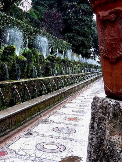 「百の噴水の小径」や水圧を利用した巨大噴水や