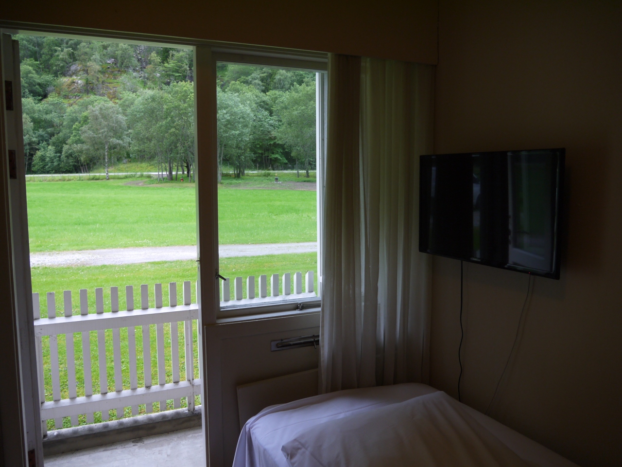 ソグネフィヨルド地区の奥に位置するラールダールの街にホテルリンドストロームはあります。ツアーで利用したので価格は解りませんが、母屋と幾つかの別棟に別れていて、私の泊った部屋はどう見てもシングルの部屋にベッドを二台入れたと思われる狭い部屋でしたが、窓の外にはベランダがあって森の中の雰囲気を感じる部屋でした。