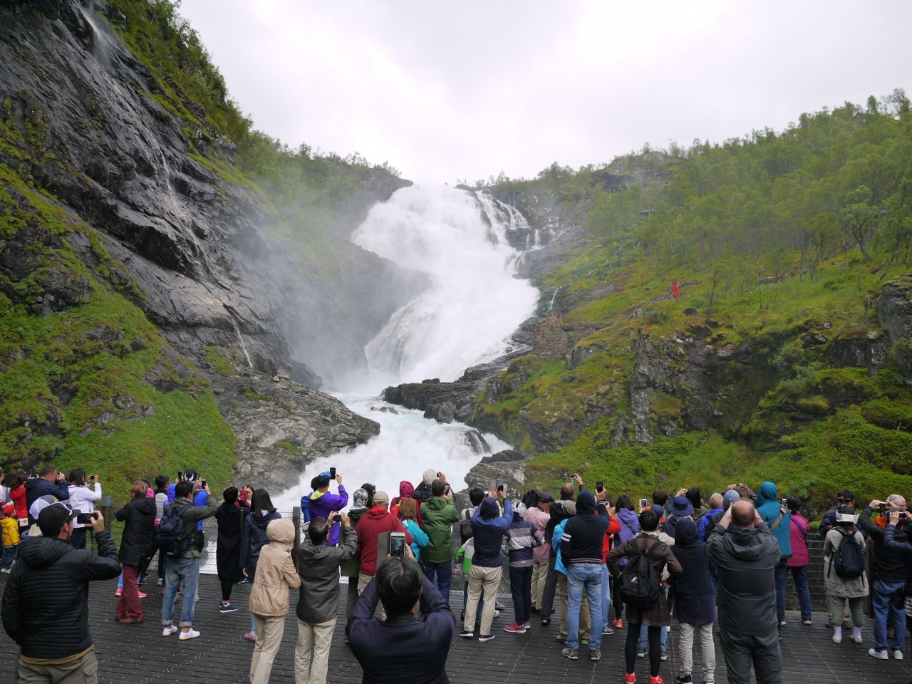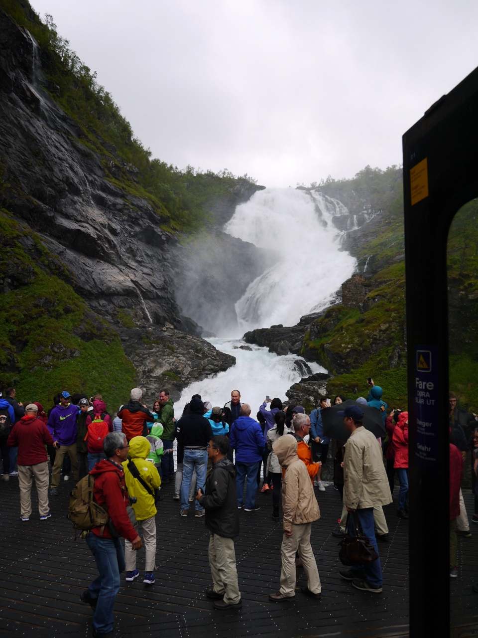 私達はツアーなので、基本的にバスで移動しますが、ショース滝を見るために、ゲイロから列車に乗って、ミュルダール駅でベルゲン急行からフロム鉄道へ乗換え、途中の駅のホームから列車の停止時間を利用してこの滝を堪能します。特に真っ赤なドレスで踊る女性にビックリ!皆さんも夏季に訪れるならチェックしてみて下さい!