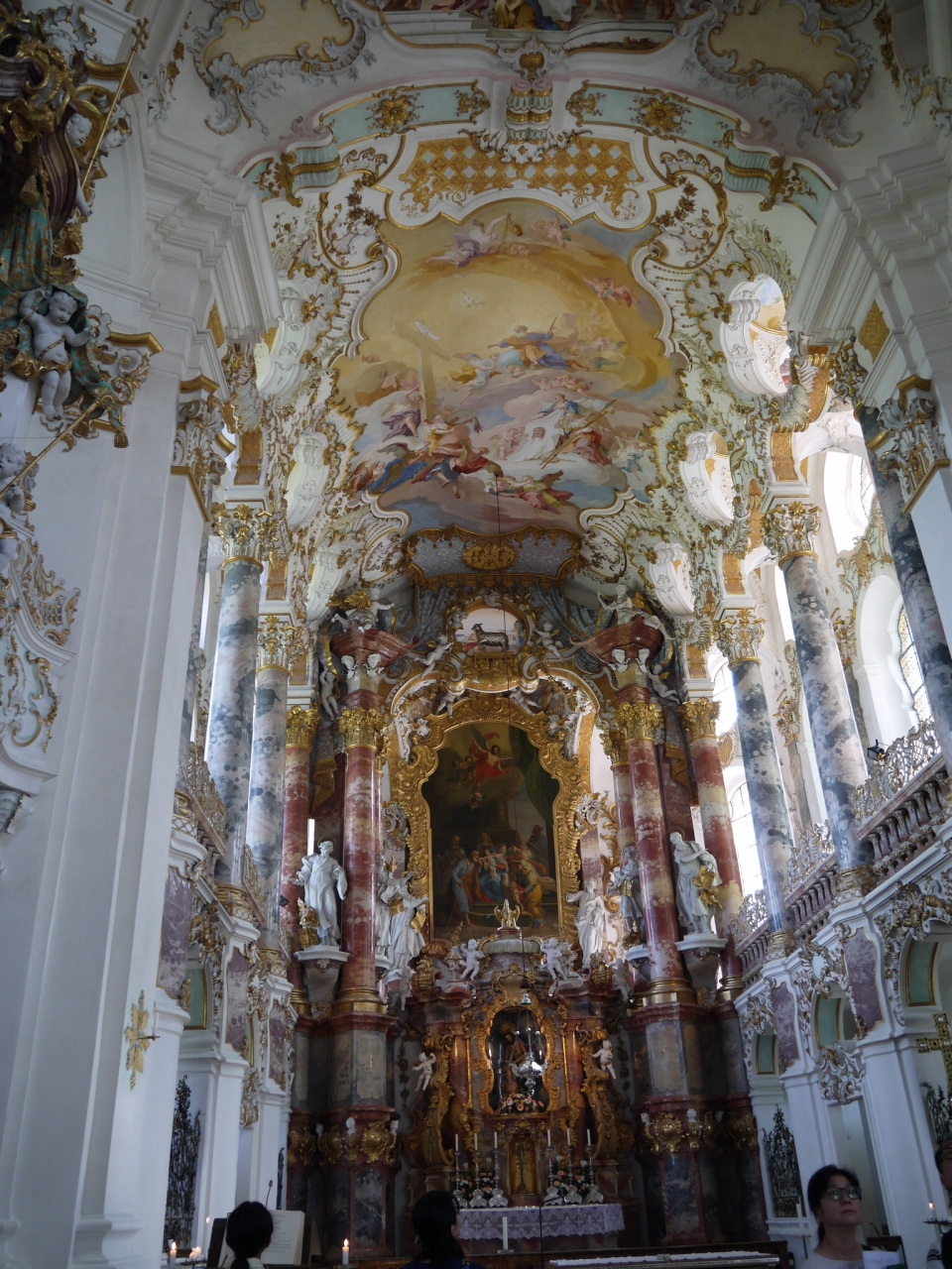 世界遺産の奇跡のヴィース教会です。個人旅行では行きにくい場所にありますが、ヨーロッパバスに乗ると途中下車で一時停止する間に軽く観光出来ます!若しくは現地ツアーでノイシュバンシュタイン城とセットで廻るのが便利だと思います。シンプルな外観に比して内部は豪華絢爛で素晴らしい教会となっています!その成立ちを知ると、シュタインガーデン修道院の修道士が彫った「鞭打たれるキリスト」の木像が涙を流したそうで、教会側はこの奇跡を認定しなかったが噂を聞きつけた巡礼者は増える一方で、教会は大幅に改修され現在に至ったそうです。