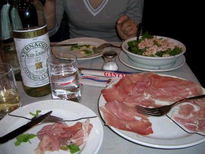 サンジミニャーノの白ワイン1本に「パルマの生ハム」と「Pizaマリナーラ」「蝦とルッコラのサラダ」は、レモンが効いて大当りでした♪ちなみに今回は〆て6.794円でした。