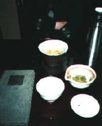一番手前の右か漬物、左が生湯葉お造りでダシ醤油がけ