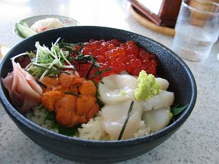 網走市場で、お食事をすることになって、まず、驚いたのが、社長が客席でお土産の商談をしており、なんなのぉ。っと思いました。昼時なのに。それから、メニューの写真と実物が違いすぎ、写真に偽りあり?って感じでしたし、この程度の魚介類なら、いつでも近所のお寿司屋さんで食べられます。写真のメニューは、これで、2500円です。