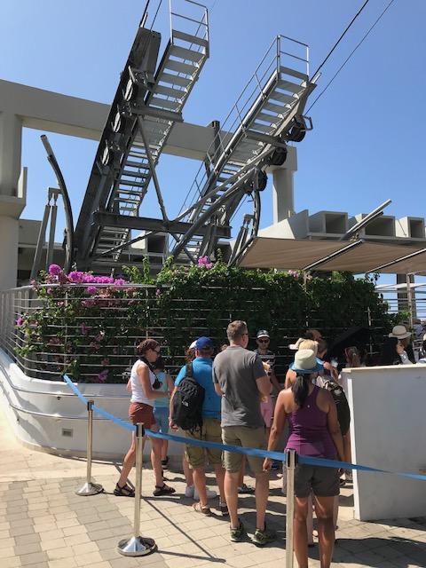 プロチェ門から歩いて5分ぐらいのところに乗り場がありました。お昼ぐらいの時間だったので混雑していないだろうと思ったのですが意外と混雑していて乗るまでに炎天下を30分ほどなたなければなりませんでした。乗ってしまえば5分ほどであっという間に頂上に到着します。景色は別群ですが、パンフレットに乗っているような角度ではありません。