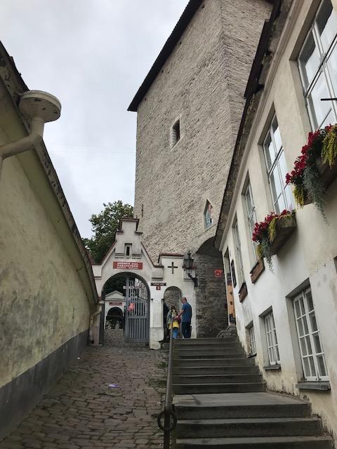 タリン市庁舎の周りのラエコヤ広場から聖ニコラス教会を経由してトームペアの丘へ向かう時に通った道です。トームペアの丘へ行く近道のようです。上りだと右側が階段、左側が石畳になっています。小雨が降っていたので、石畳は滑りやすいのでみんな階段の方を通っていました。