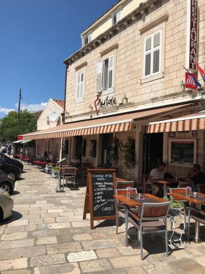 ドブロブニク観光で空港バスに乗って終点の長距離バスターミナルに近いホテル ペトゥカに宿泊しました。ドブロブニクの城壁にあるレストランはどこも観光客向けの価格でかなり高かったので、ホテルの近くまで戻ってここで食事にしました。バーもあるおしゃれなお店でした。