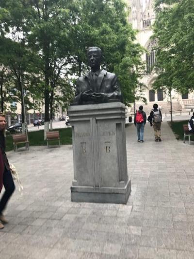 サンミッシェル大聖堂の前にある公園です。公園といってもそんなに大きなものではありません。聖堂の正面にギュデュル像がありました。ギュデュル像と緑の向こうにサンミッシェル大聖堂が見えました。サンミッシェル大聖堂大聖堂の正式名称は聖ミッシェル・聖ギュデュル大聖堂だそうで、聖ギュデュル公園 の名はそこから来ているそうです。