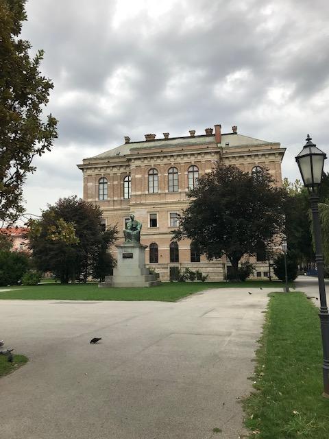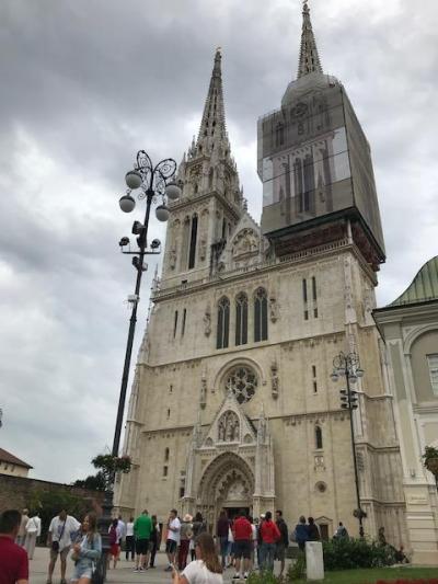 来た道(南側から)からみるとイェラチッチ広場の右奥に別名聖母被昇天大聖堂とも言われるザグレブ大聖堂があります。かなり遠くからでもザグレブ大聖堂の塔が見えるので、これを目印にすれば自分の場所がだいたいわかるのでありがたかったです。右側の塔が工事中だったので、ちょっと残念でした。