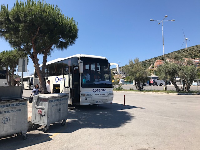 チェシメ には生き方が2つあって、イズミール 空港から直行便のハバッシュという空港バスに乗るか、Farhttin Altayという地下鉄の駅の近くからバスに乗るかですが、いずれもこのチェシメ バスターミナルに到着します。バスターミナルというよりもただの広い駐車場という感じです。ここからキオス島行きのフェリー乗り場までは歩いて10分ほどです。