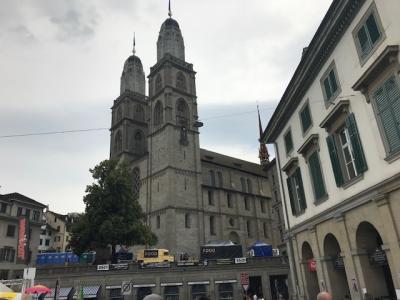 チューリッヒ駅から、リンデンホフの丘、聖ペーター教会、フラウミュンスター と歩いて、ミュンスター橋を渡ってこの大聖堂にたどり着きました。ちょっとだけ高い場所にあり、階段を登ります。遠くからでも2つの尖塔が目印になるので、すぐに場所がわかります。教会内は落ち着いた雰囲気ですが、この時はミニコンサートのようなものをやっていました。塔に登るのは有料ですが、中に入るだけなら無料です。
