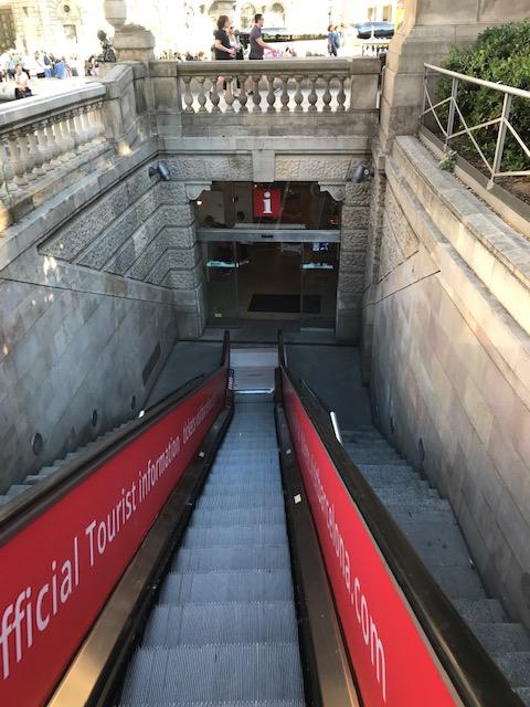 バルセロナ空港からバスに乗って終点のカタルーニャ広場で下車すると、目の前に赤い看板でインフォメーションの目印がありました。下りのエスカレーターがあり、カタルーニャ広場の地下に潜っていく感じです。色々なパンフレットが揃っていますし、アクセスも良く便利でした。