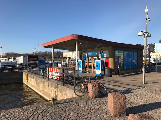 スオメンリンナ島へフェリーで渡りました。マーケット市場に乗り場があります。1ディチケットを持っていたのでそれで乗車できました。3台ぐらい自販機もあったので、その場でも購入できると思います。朝の早い時間だったので、空いていました。小さな待合室もありました。