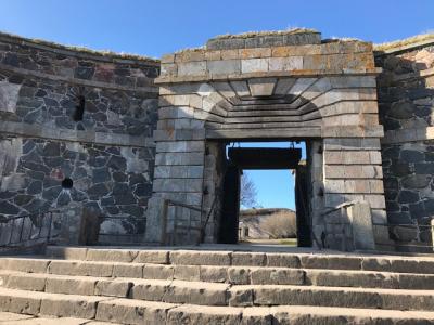 ヘルシンキのマーケット広場にあるフェリー乗り場からフェリーに乗って約15分で島に到着です。フェリー乗り場は島の北端で、スオメンリンナの要塞の一番有名なKings Gate は島の南端にあるので、これを見るには島を温暖する形で30分ほど歩かなければなりません。途中にいくつか博物館がありますが、10時が開場なのでそれよりも早く行ってしまい、中を見ることができず、残念でした。