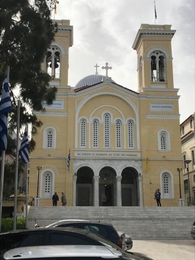ギリシャの港町ピレウスにあった教会です。ピレウスはアテネから地下鉄で20分強で行くことが出来て、想像以上に海が近かったです。有名なアギア トリアダ大聖堂のすぐそばというか公園の反対側にありました。薄い黄色のパステルカラーが美しい2つの尖塔を持つ教会でした。日曜にでミサをやっていて中には入れませんでした。