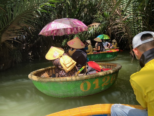 ホイアンの旧市街からGrabに乗って約20分ぐらいです。ココナッツボートといえばGrabの運転手も良く知っていました。乗り場に案内されましたが、たくさんの乗り場(会社)がありますので、値段交渉して決めれば良かったのですが、面倒なので言い値の700Kドンで決めました。かなりぼったくられていると思います。考えられないぐらいたくさんの丸い竹のボートがあります。これでココナッツ林の中を進んでいきます。約40分のアトラクションでしたが、とても楽しむことができました。