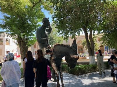 ラビハウズとナディールディヴァンベギメドレセの間が小さな公園のようになっていて、そこに人だかりができていたので行ってみるとこのフッジャ ナスレッディン像がありました。写真を撮るだけでなく、この像にみんなが触るので、一部分はピカピカになっていました。かなりの人気の場所です。ッジャ ナスレッディンはトルコの一休と呼ばれる雄弁な機知を持つ人だったそうです。