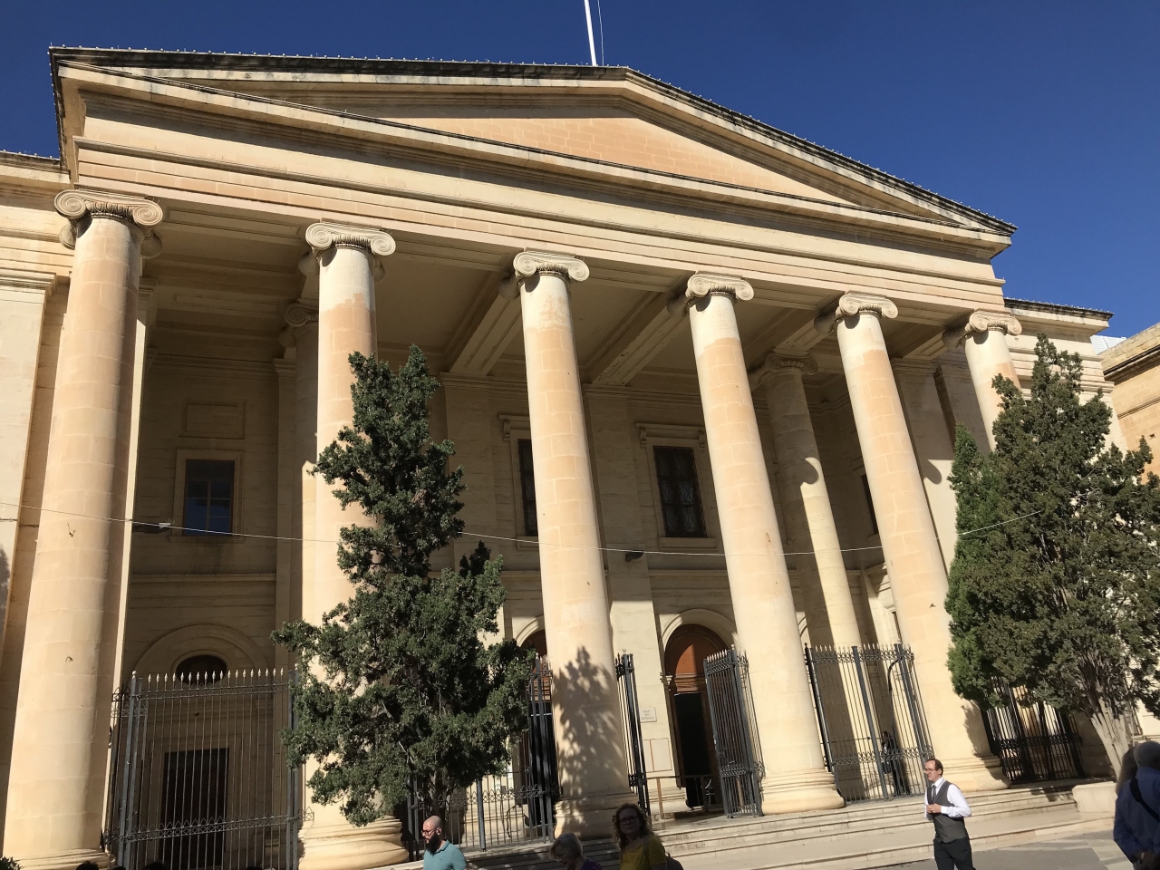 アッパーバラッカガーデンから歩いていくと、聖ヨハネ大聖堂の正面に出ました。聖ヨハネ大聖堂内に入るには正面とは反対側の裏口に回る必要があります。裏に回ると、ギリシャ神殿風の立派な建物がありました。調べてみたら裁判所でした。なんで裁判所がギリシャ神殿なんでしょう?
