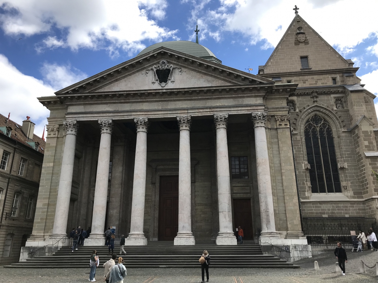 レマン湖のほとりのジュネーブの旧市街の中にあります。ジュネーブに来たらここは訪れるべき場所というこよで行ってみました。旧市街は丘の上にあります。レマン湖から歩いて行けます。建物はギリシャ神殿のような円柱の柱が見事なものでした。教会内は意外とシンプルでした。