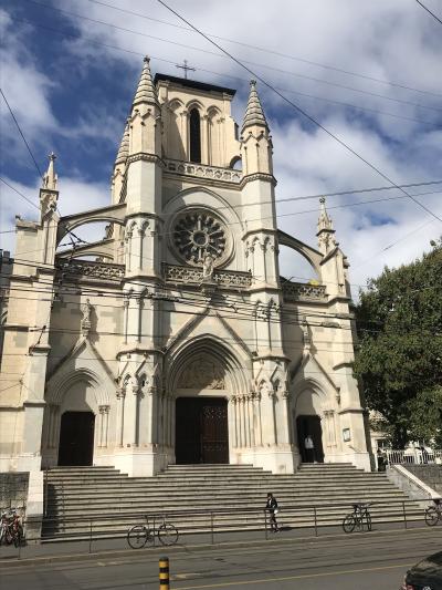 ジュネーブの中央駅のコルナヴァン駅からすぐの場所にあります。駅構内から外に出て右を見るとこのジュネーヴ ノートルダム聖堂が見えます。外観はゴテゴテしていますが、教会の中に入ると、とてもシンプルな作りでした。派手な境界も良いですが、シンプルだと信仰心をより強く感じます。