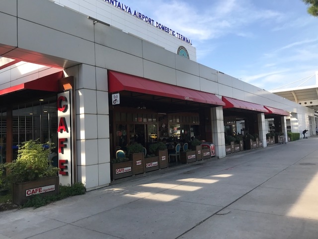 トルコのリゾート地として有名なアンタルヤ空港の国内線ターミナル出口近くにあるカフェです。アンタルヤ空港にはフリーWifiが飛んでいませんが、このカフェでWifiが使えます。チャイ1杯8リラで、お茶を飲みながらフライトまでの時間を潰しました。
