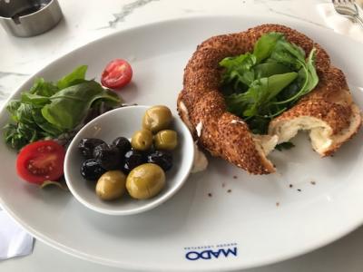 ガラタ橋の東にあるフェリー乗り場からフェリーに乗って金角湾をクルーズするつもりだったのですが、フェリーの本数が思ったよりも少なくて時間が余ったので、このカフェで朝ごはんを食べることにしました。Madoはトルコのあちこちで見かけるお菓子屋さんです。ここは朝早くから朝ごはんをやっていて便利です。いろいろな種類の朝ごはんがありましたが、せっかくなのでトルコ式の朝ごはんを注文しました。