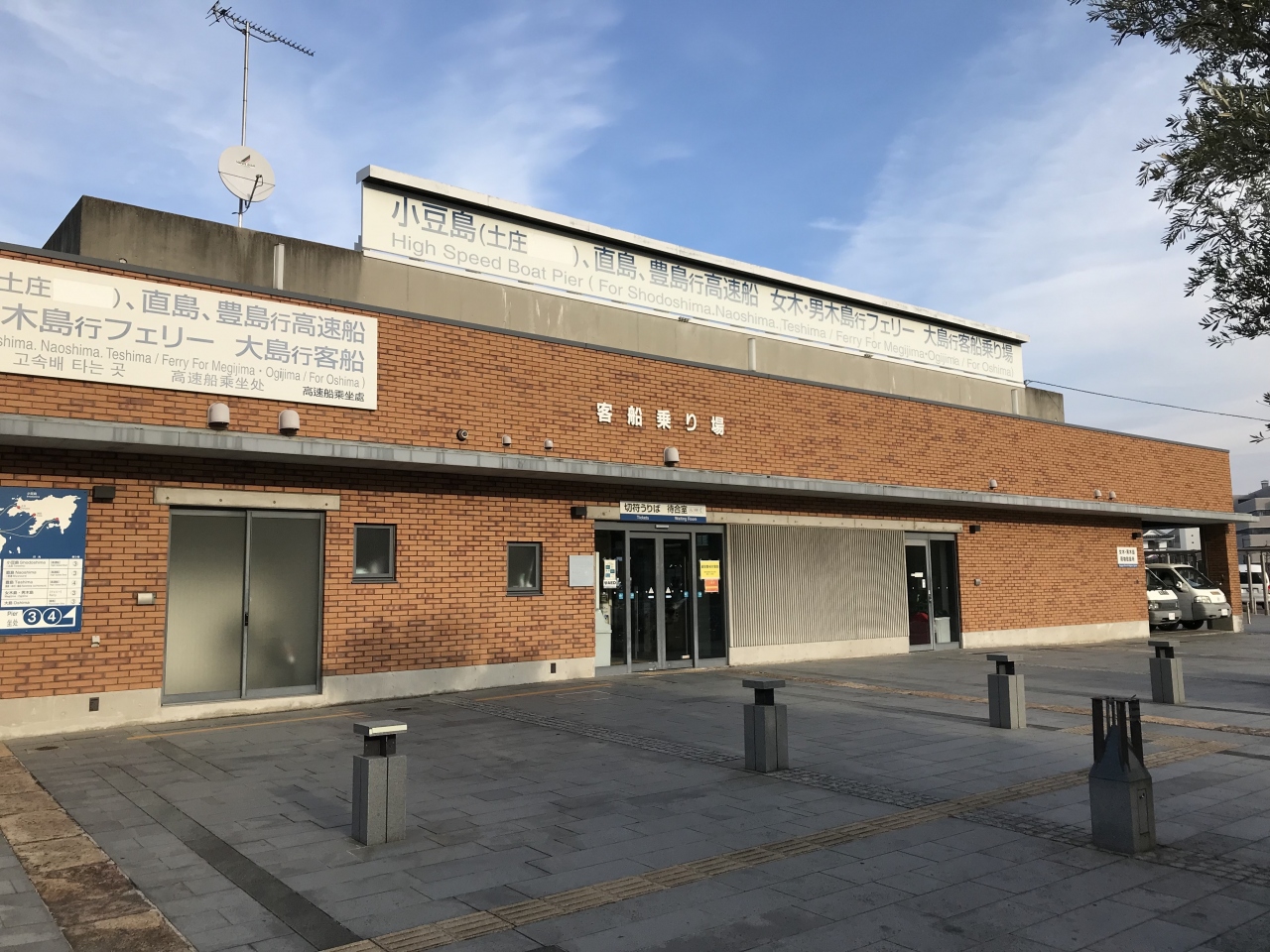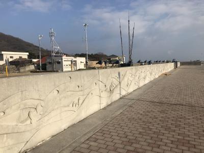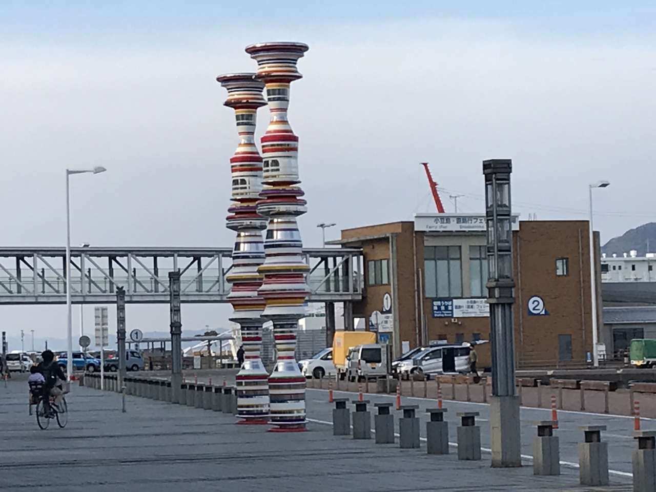高松観光でJRクレメントイン高松に宿泊したので、女木島・男木島行きのフェリー乗り場はすぐ目の前でした。朝早く女木島・男木島行きのフェリー乗り場のすぐそばにこのオブジェがあります。不思議な感じですが、なぜかとても印象に残るオブジェでした。