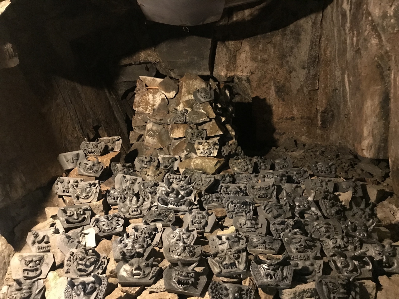 女木島の観光名所の鬼ヶ島洞窟の中にありました。鬼ヶ島洞窟は高さが低いので中腰で進んでいかなければなりませんが、ところどころにこのオニノコ 瓦プロジェクトという瓦で出来た鬼の仮面みたいなものが無造作に展示されています。最初はなんだかわかりませんでした。