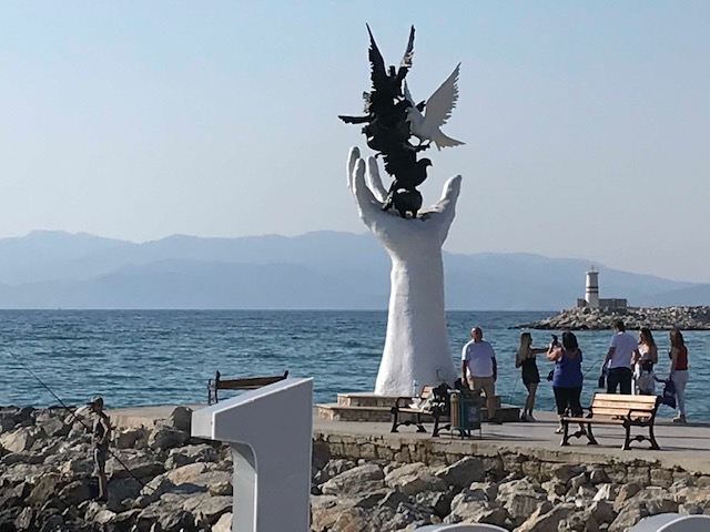 トルコのイズミール郊外のローカルなリゾート地クサダシのビーチにあるオブジェクトです。クシャダスの象徴の一つである芸術作品の一例で、手のひらに乗る鳥のように、自由を表現しているそうです。ホテルが街の中心部の海岸沿いだったので、このオブジェクトはすぐそばにありました。