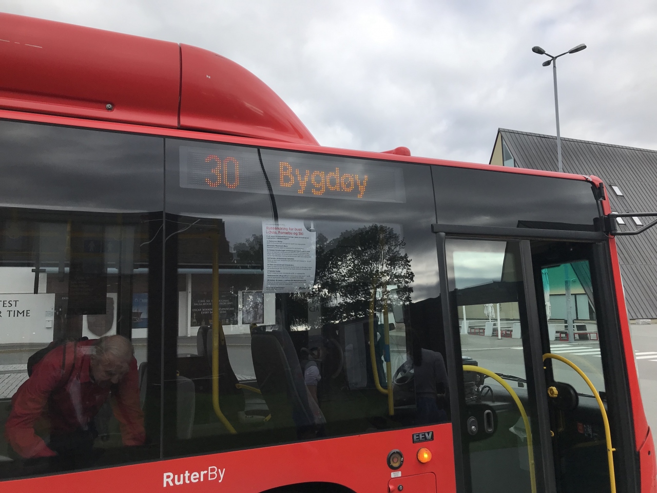 オスロの公共交通機関はトラムや地下鉄など充実しています。市内やヴィーゲラン彫刻公園の観光にはトラムが便利ですが、ノルウェー民族博物館、ヴァイキング船博物館、ノルウェー海洋博物館、コンティキ号博物館、フラム号博物館があるビグドイ地区にはバスしかありません。30番バスになります。西洋でよくあるごくごく普通な感じのバスです。
