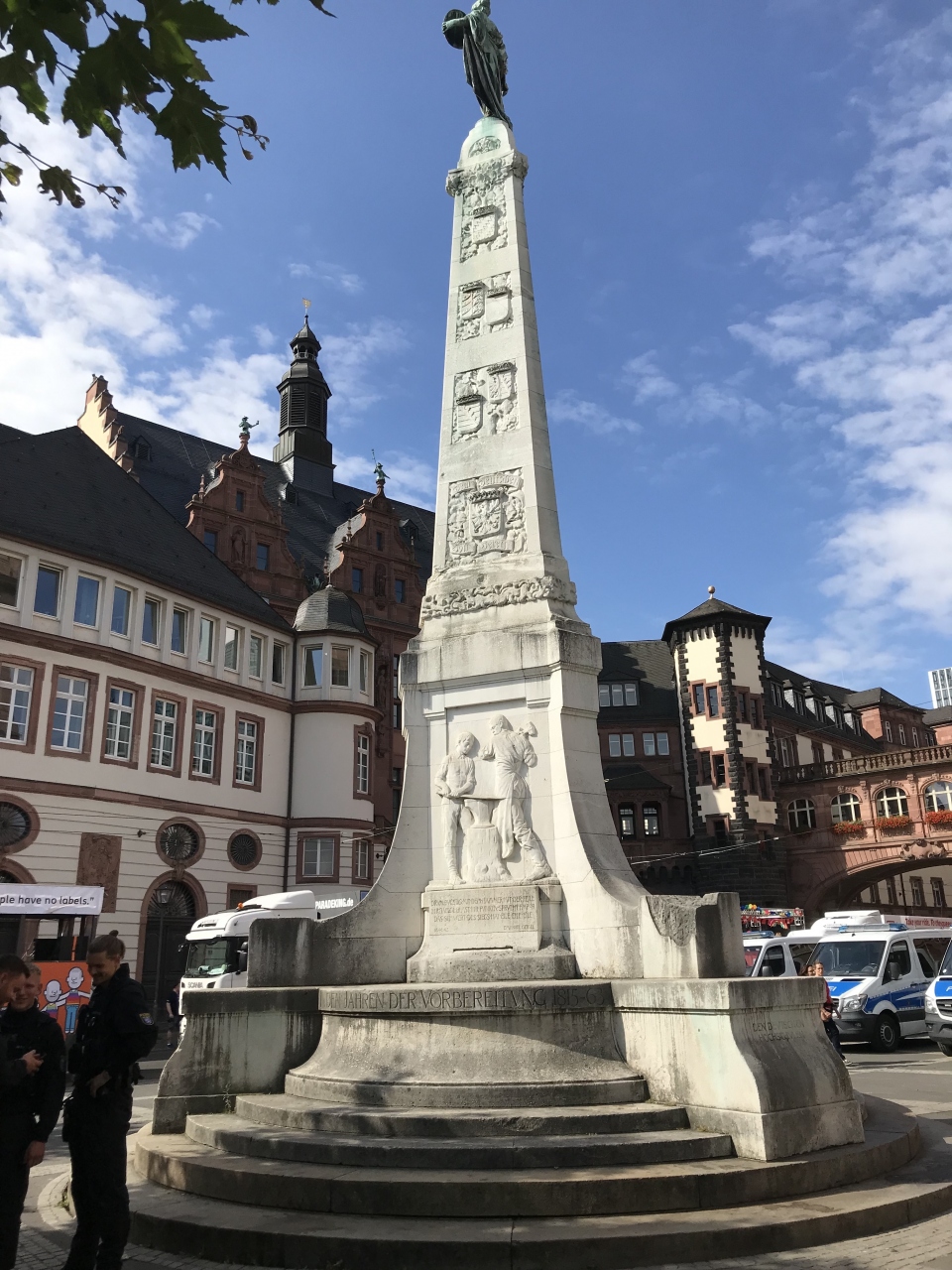 レーマー広場に面している聖パウルス教会の手前に建っている記念碑です。この辺りは赤煉瓦の建物が多い中で、この白っぽい記念碑はよく目立っていました。ぱっと見はオベリスクみたいですが、普仏戦争後のドイツ統一を記念して建てられたもののようです。