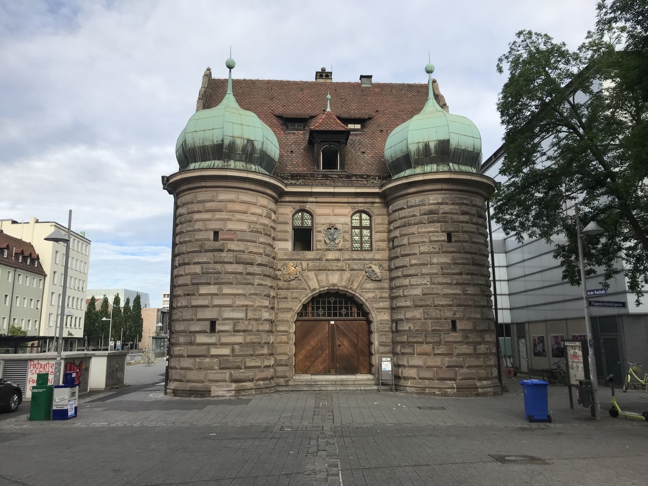 ニュルンベルクの大通りのケーニッヒ通りから1本中に入った場所に、とても面白い形の建物があったので行ってみました。ロシア教会のような玉ねぎ頭の低い塔が2つあります。近寄って色々調べてみたら、警察署の建物だとわかりました。なんで警察署がこんな形の建物なのかよても不思議でした。