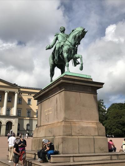 オスロの観光の見どころの一つノルウェーの王宮にあるスウェーデン王カール・ヨハンの騎馬像です。王宮が建てられた19世紀はノルウェーはスウェーデンに支配されていたため、スウェーデン国王が同時にノルウェー国王を兼任していたため、スウェーデン王の騎馬像があるのだそうです。オスロ中央駅から、メインストリートをまっすぐに歩いていくと、西の突き当たりが小高い丘になっていて、最初に見えるのがこのスウェーデン王カール・ヨハンの騎馬像です。その後ろに薄い黄色のノルウェーの王宮が見えてくるので、このカール・ヨハンの騎馬像は印象的でした。