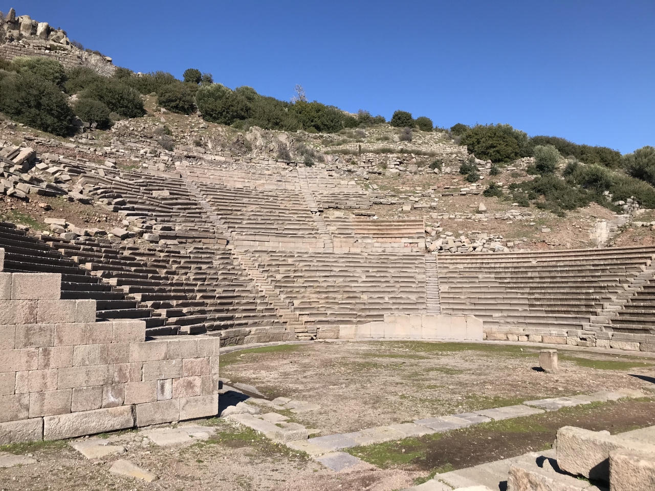 アソス遺跡は広大で、ほぼ山の頂上付近から海辺まで広がっています。宿泊したホテルが頂上付近の入口近くにあり、神殿を見た後に階段を下ってこの劇場へ向かいました。修復はされていますが、立派な劇場で、よくこんなものを作ったものだと感心しました。
