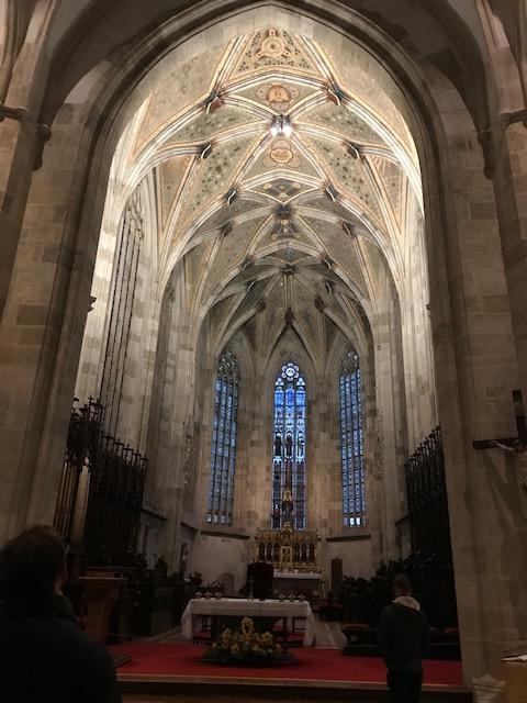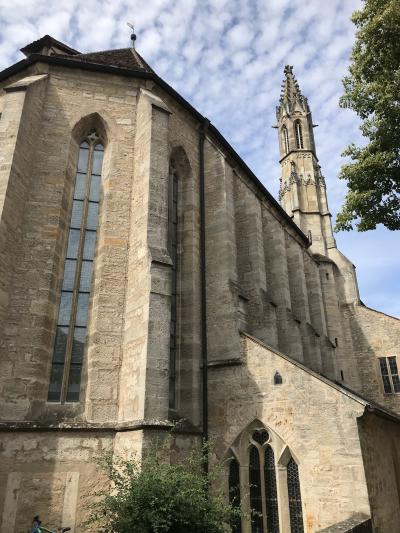ローテンブルグの中心のマルクト広場からブルク公園へ向かって、西の方へ坂を下って行くと左手にこのフランシスコ修道会教会がありました。ローテンブルク市で最も古い教会の 1 つだそうです。修理中で建物の一部が覆われていましたが、とても大きな教会で観光的にが有名ではないようでびっくりしました。
