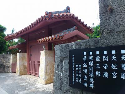 波上ビーチから波上宮へ廻って参詣を済ませた後に、県庁の方に歩いて戻る途中にあった場所です。紅い塀で囲まれていて、門が開いていたので中をのぞいて見ると、緑の芝生の向こうに如何にも琉球という感じの建物がありました。門を過ぎると天妃宮 ・天尊廟地という表示があって、ようやく何なのかがわかりました。