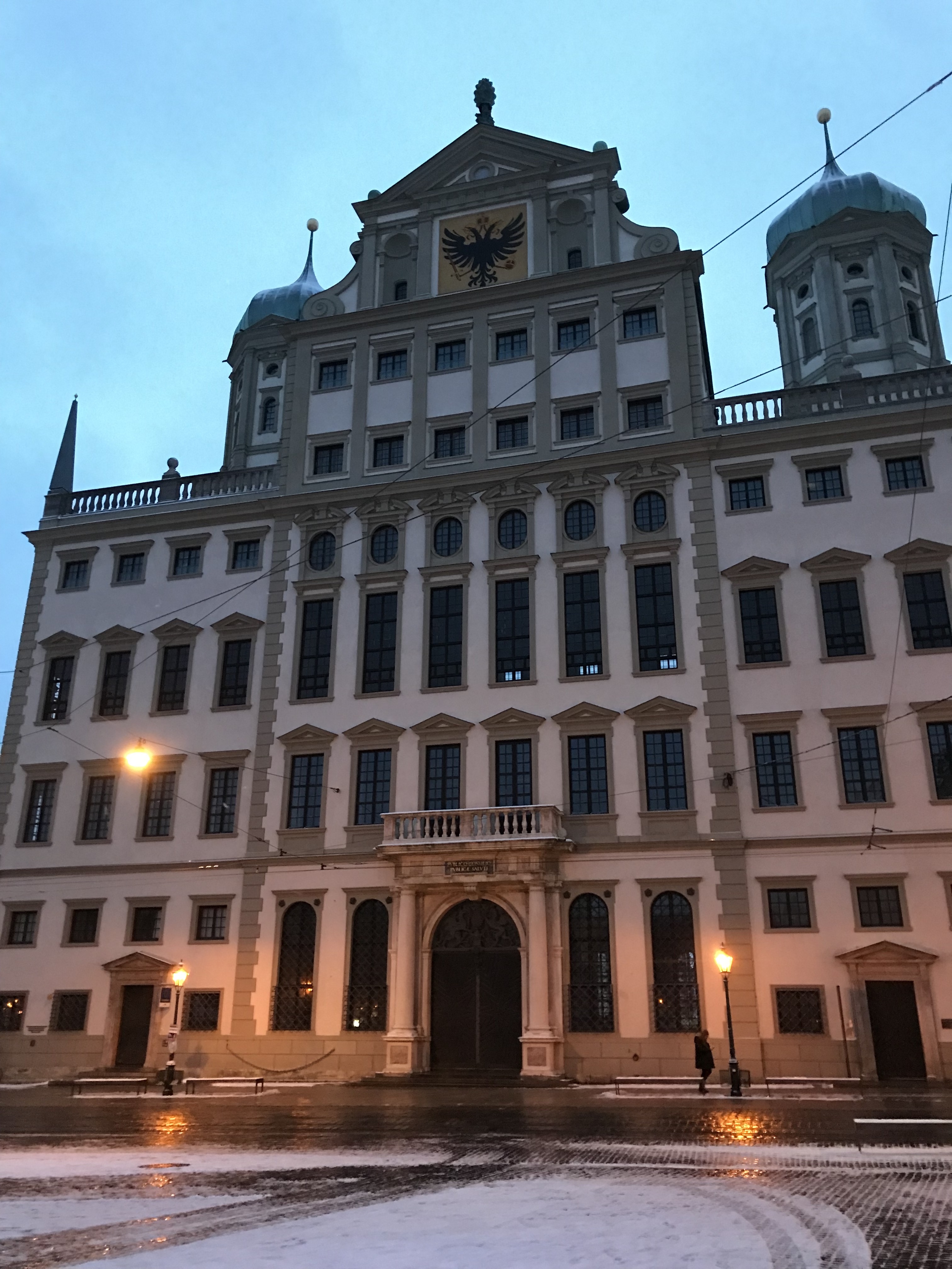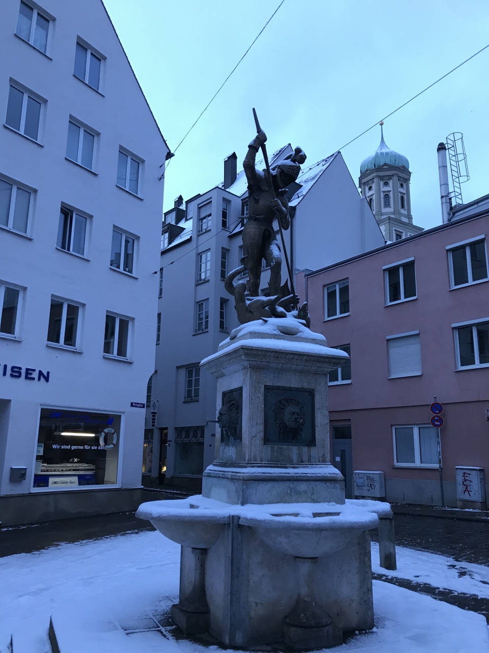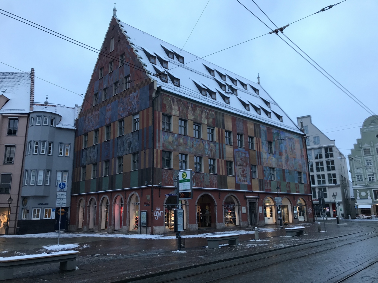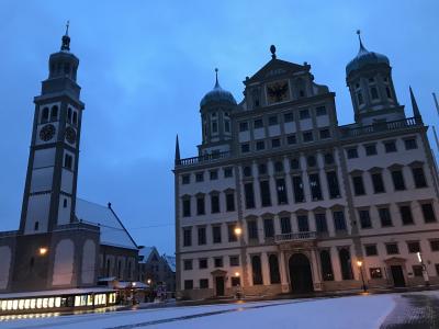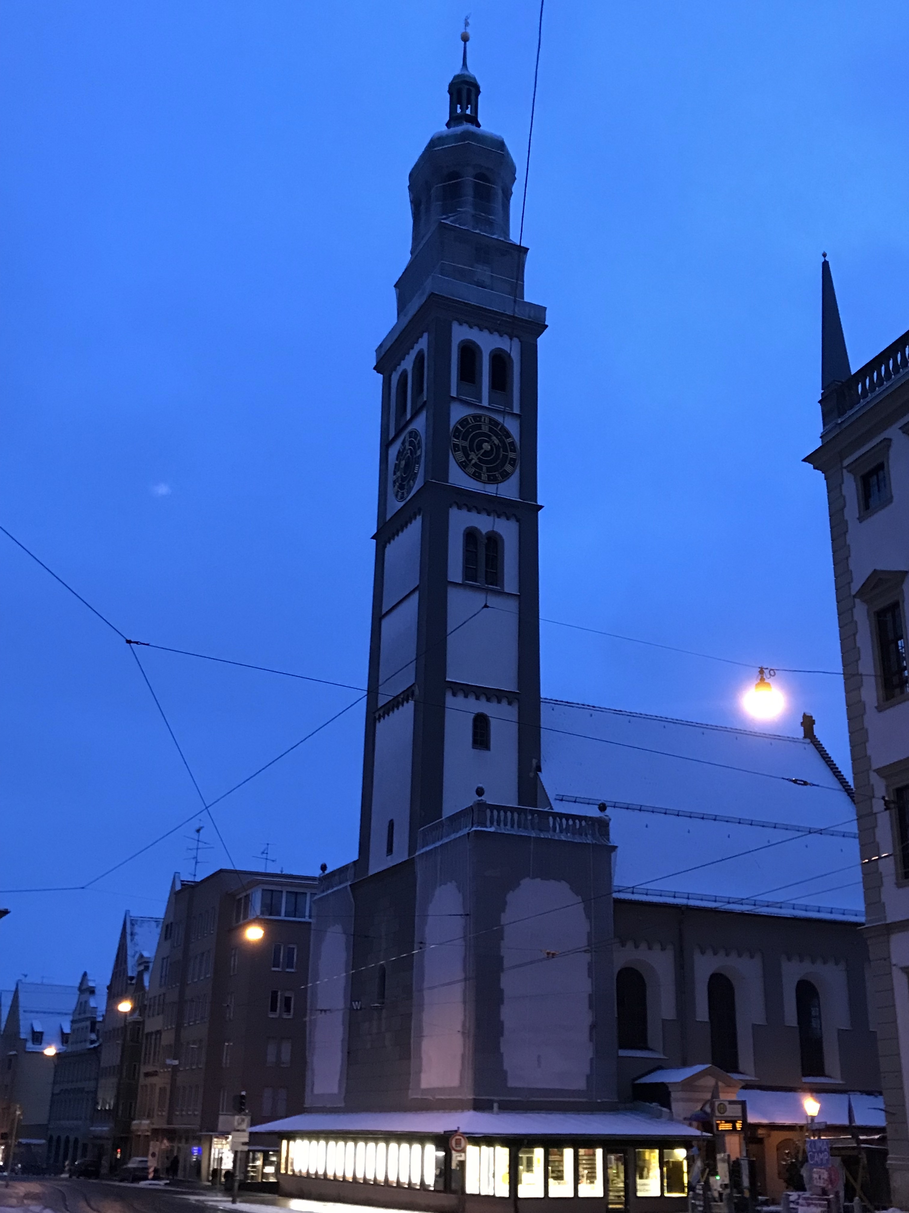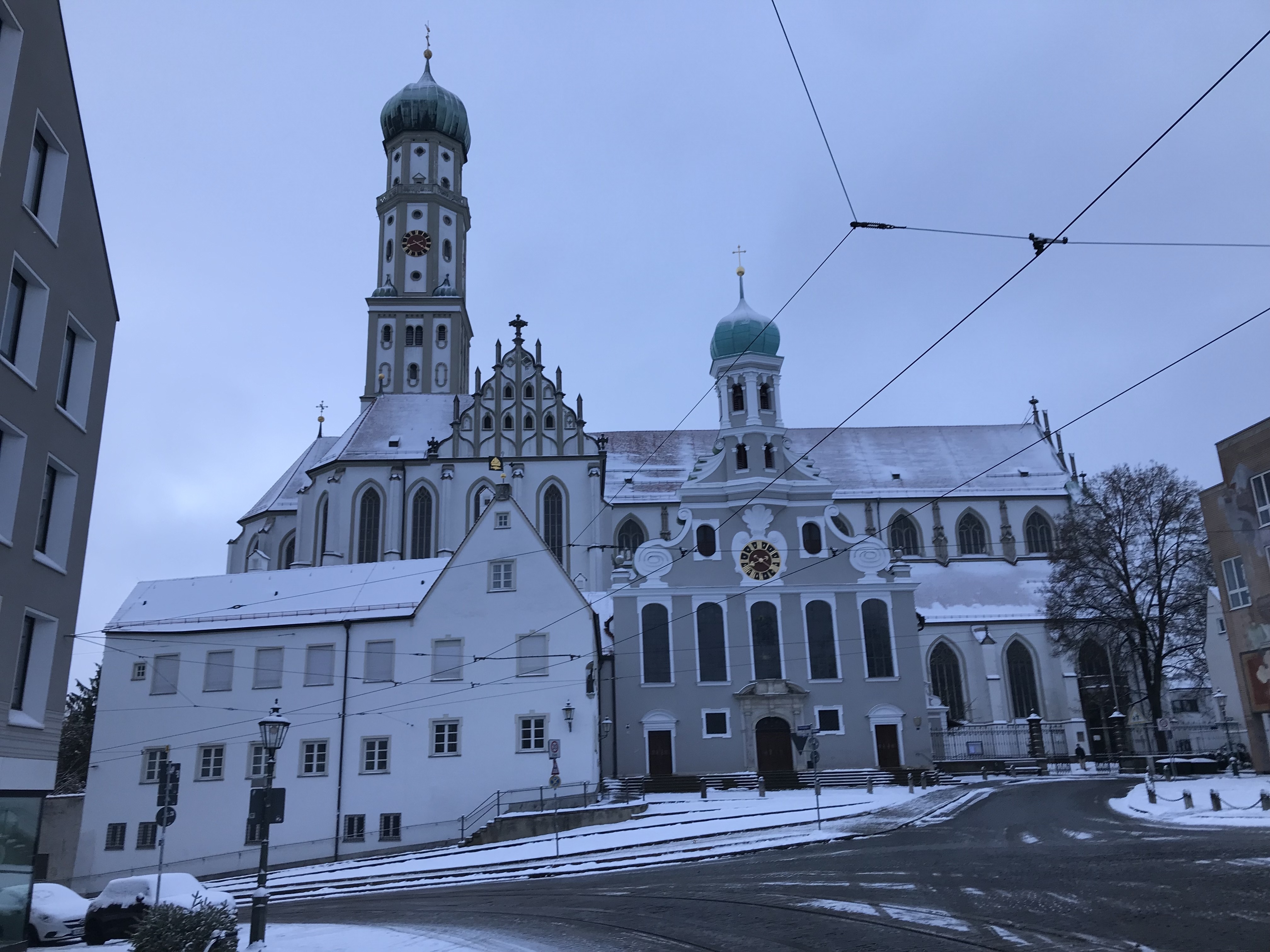 アグスブルク市庁舎から北へ歩いて10分ほどの場所にありました。朝早く行ったので、開いているかわかりませんでしたが、扉が開いたので中に入ってみると、ちょうど朝のミサの最中でした。ステンドグラスを見たかったのですが、ミサの邪魔をしてはいけないのでやめました。雪を被った外観も素敵でした。