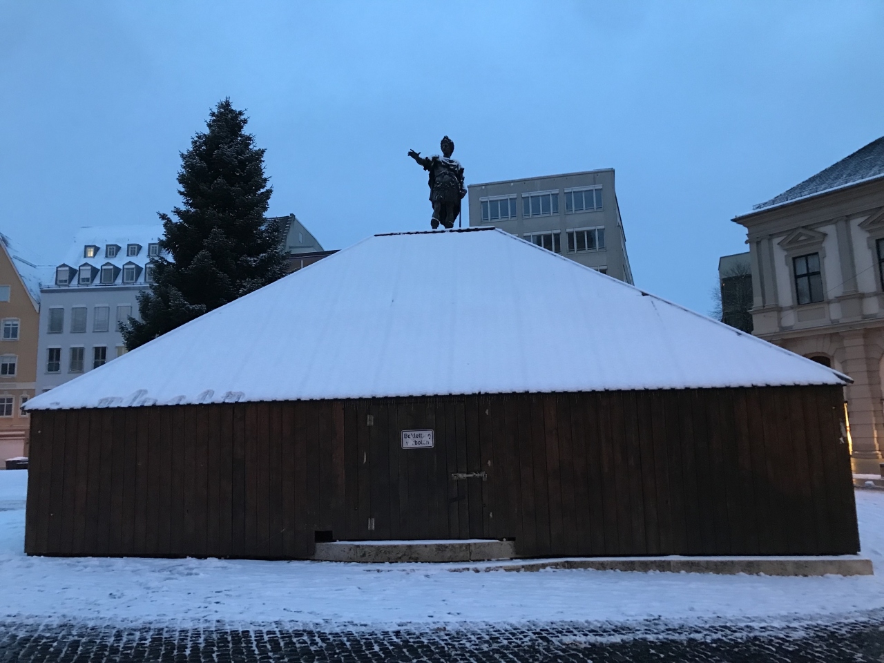 黄金の間で有名なアグスブルク市庁舎やペルラッハ塔の前に広がる市庁舎前広場にありました。アウグストゥス噴水、メルクリウスの噴水、そしてこのヘラクレス噴水がアウグスブルクの三大噴水なのだそうです。多分雪防止のための囲いだと思われますが、囲いに覆われた姿が珍しかったです。