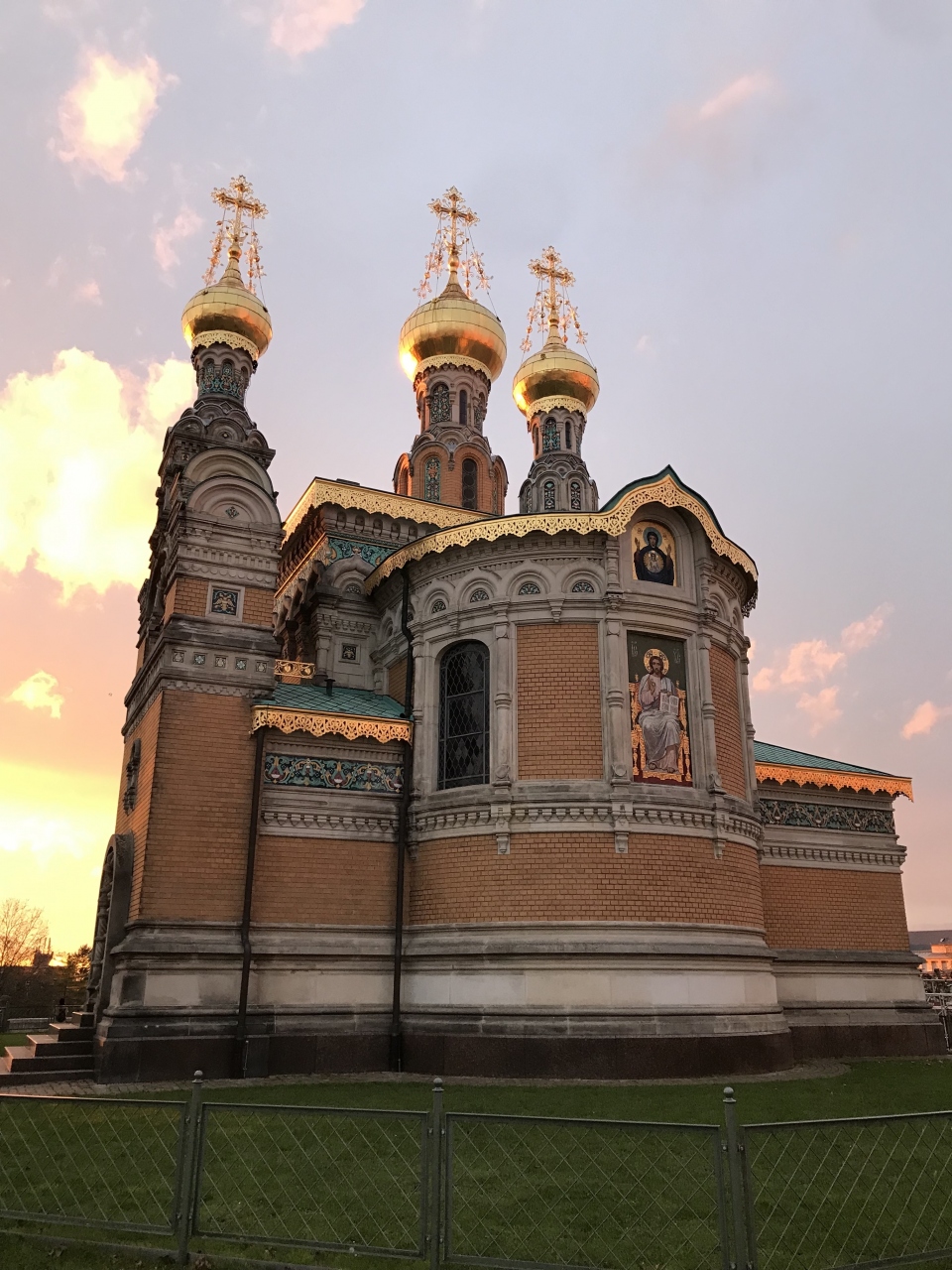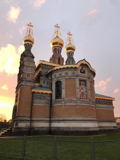ダルムシュタット中央駅からマチルダの丘へバスで行きました。バス停を降りて坂道を登っていくと、結婚記念塔が見えて来ました。丘に到着すると、結婚記念塔のすぐそばに、このロシア教会(ダルムシュタット)がありました。そんなに大きな教会ではありませんが、まさにロシア教会という感じのつくりの教会でした。