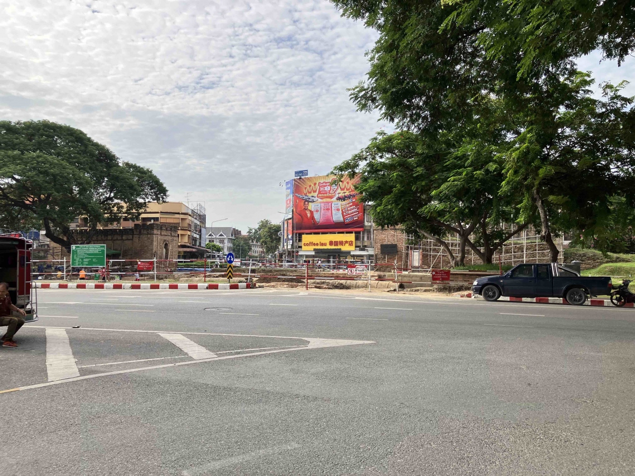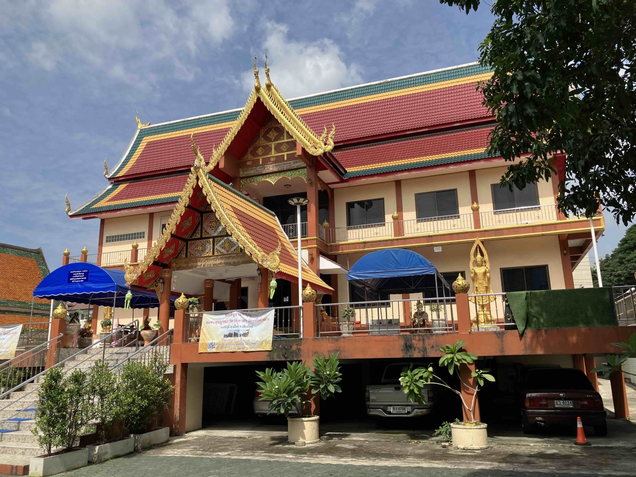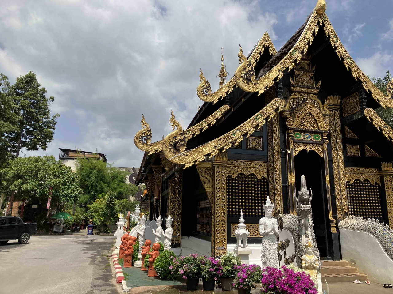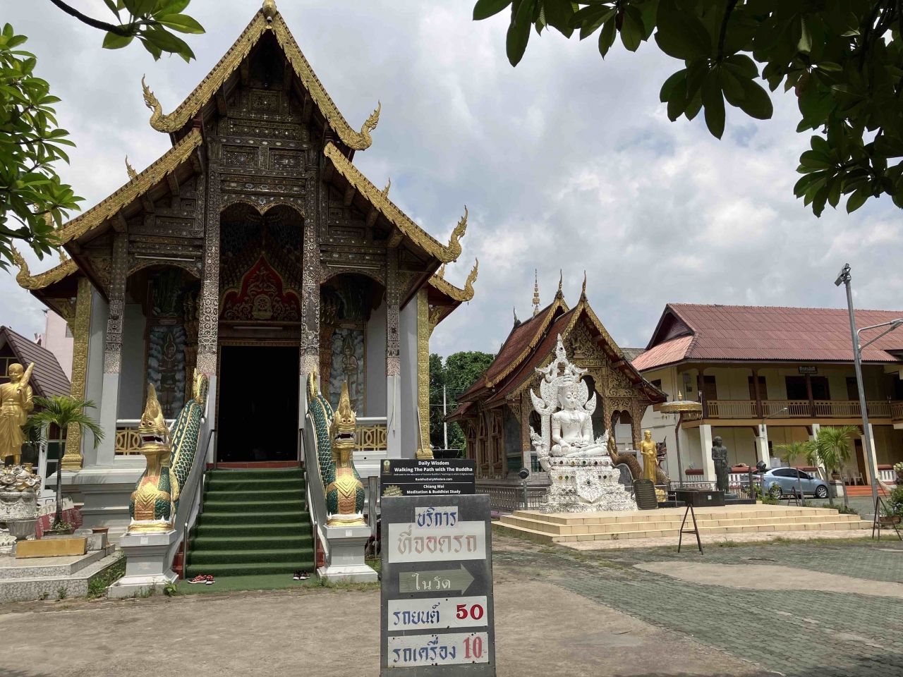 三王像広場からギビング ツリー マッサージへ行く途中にあったお寺です。三王像広場の隣にあるチェンマイ文化芸術館の南側の道沿いにありました。本当に道沿いに本堂があり、珍しいと思いました。本堂の入口にあった竜のオブジェがタイのお寺だと感じました。