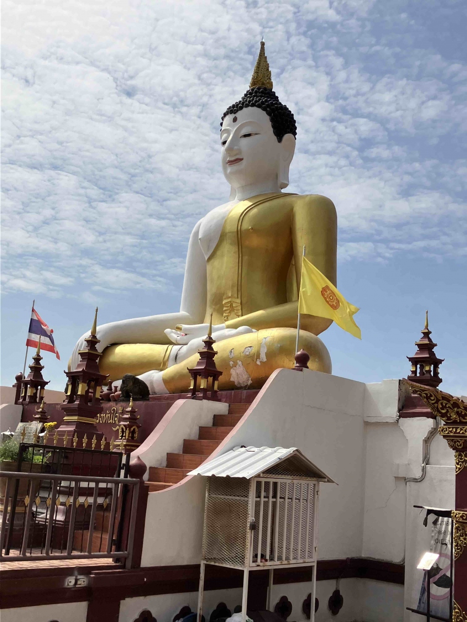 チェンマイの最大の観光地のドイステープを参詣し、ソンテウでチャーンプアック門に戻る途中にワット ローク モーリーで途中下車しました。チャーンプアック門から旧市街の中に入ろうと思ったのですが、めぼ前のお堀に橋が架かっていて、そのさきに素敵なお寺が見えたので、橋を渡って行ってみました。黄色の大きな仏像が外にあって圧倒されました。