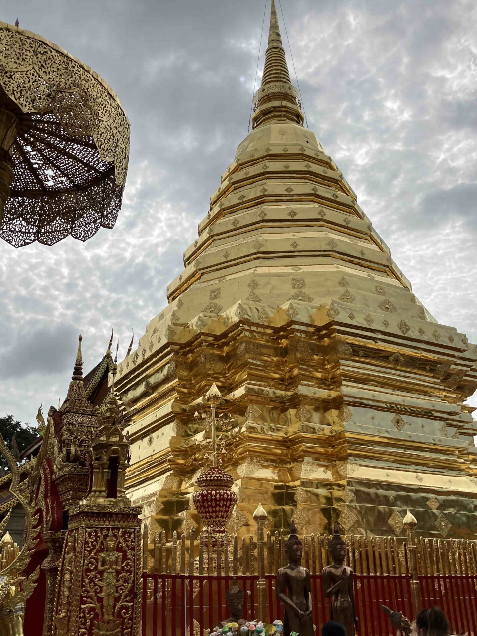 チェンマイの最大の観光地ですが、旧市街からはだいぶ離れています。チェンマイの旧市街の北側にあるチャーンプアック門にあるドイステープ行きのソンテウ乗り場から行くのが一般的です。チャーンプアック門から約40分で到着。かなり高い場所にあるので、途中はずっとのぼり坂でした。本堂に行くには長い階段を登るかケーブルカーです。そこへ辿り着くと、まばゆいくらいの黄金に輝く仏塔があります。