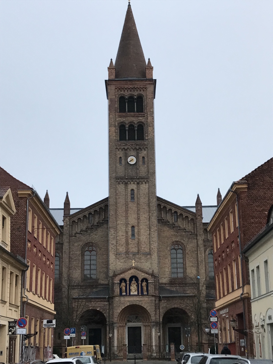 ポツダムの旧市街の北東にあるオランダ街からブランデンブルク門に歩いて向かう途中で見つけた教会です。ブランデンブルグ通りの東側を閉じ端にあり、反対の西端にはポツダムのブランデンブルグ門があります。黄色いレンガ造りの建物で高さ約 60 メートルのイタリア製鐘楼が印象的です。詳しくはわかりませんが、ビザンチン様式とロマネスク様式を組み合わせているそうです。
